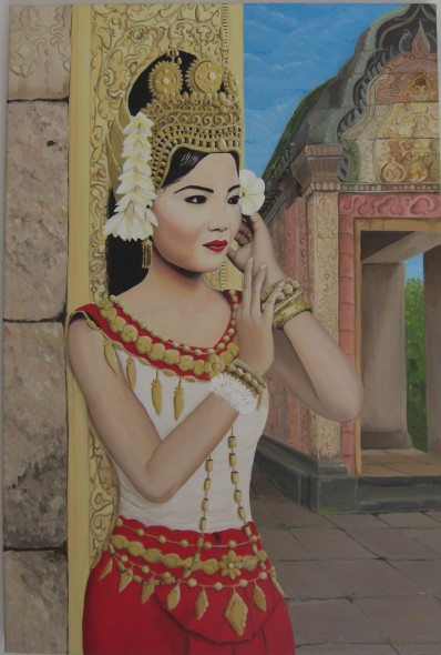 Apsara: Óleo sobre lienzo de algodón de 40x60. Realizada en Genova, Italia en Diciembre 2011. Obra para la colección "Mujeres del mundo", obra figurativa con composición estable por las líneas verticales. Los distintos dibujos que forman parte del escenario y los adornos rompen con la quietud de la pose de la figura. La técnica son unas veladuras e impactos con pincel. Se trata de una composición análoga donde los colores calidos predominan, el amarillo, naranja y ámbar representan el ambiente festivo de la escena dónde la protagonista está dándose los últimos retoques para salir al escenario, el rojo brillante crea la atracción a la mirada. Los colores dorados están conseguidos a base de mezclas. Contrasta un esquema dónde se subdivide el escenario en 2 partes, en la izquierda existe la perspectiva mientras que la derecha avanza por los tonos más vivaces. Las apsaras eran ninfas, representa el nombre de una danza camboyana. Apsara: Oil on canvas 40x60 cotton. Made in Genoa, Italy in December 2011. Work for collection "Women of the world," figurative work with stable composition by the vertical lines. The various drawings forming part of the scenery and decorations break the stillness of the pose of the figure. The technique is a glazing and impacts brush. This is a similar composition where the predominant warm colors, yellow, orange and amber represent the festive atmosphere of the scene where the protagonist is giving the finishing touches to go on stage, the bright red creates attraction to the eye. The golden colors are made from a mixture. Contrast a scheme where the stage is divided into 2 parts, on the left there is the prospect while the right moves for the lively tones. The apsaras were nymphs, represents the name of a Cambodian dance.