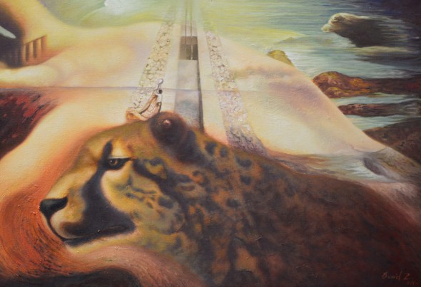 surrealismo figurativo, imagen desnuda al fondo mimetizada con el paisaje de fondo figuras diversas hacia un camino sin regreso marcado por una reja y uba figura felina x despertar.