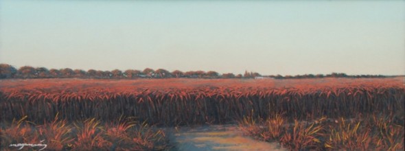 Paisaje pintado al atardecer en un camino que me llevaba a un campo de trigo, del que me asombró como cubría la luz del atardecer el trigal y las sombras proyectadas sobre el camino.