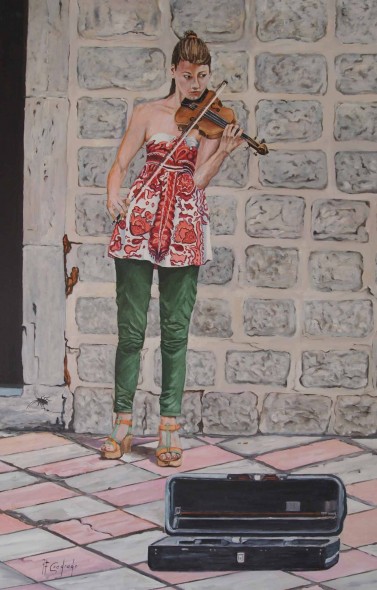 Obra realizada con Tec.Mixta sobre lienzo,medidas: 100X65cm.representa la música callejera en Dubrovnik, Croacia, Año de ejecucion 2015.