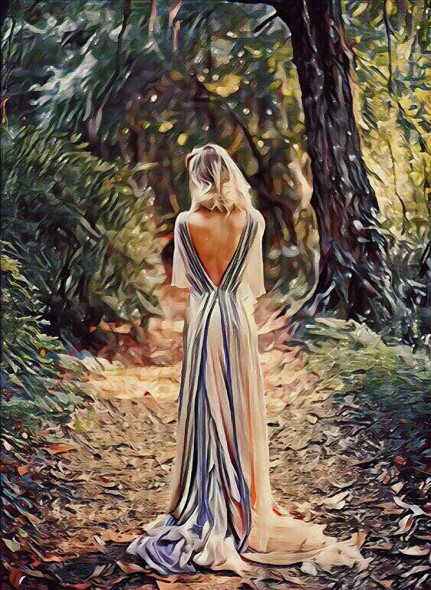 Mujer con vestido largo paseando por el campo