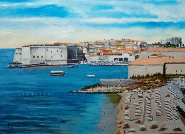 Obra realizada con acrílico sobre tabla,54X39 Cm.representa el puerto viejo de Dubrovnik, año 2025.