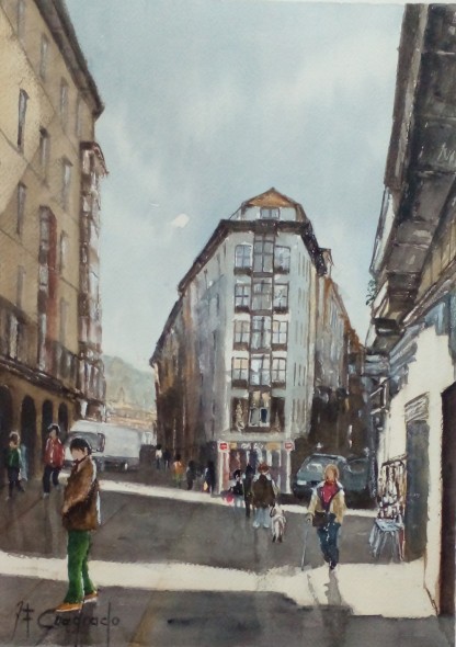 Obra realizada con acuarela sobre papel, 38X28 Cm. Año 2026, se trata de una calle del Casco Viejo de Bilbao.