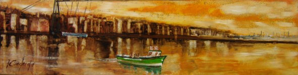Obra realizada con Técnica-Mixta, sobre Carton Piedra. Medidas: 37X10cm.En estilo Impresionista. Representa el pasaje en Bote de una margen a otra de la Ría, se encuentra al lado del Puente Colgante de Portugalete-Vizcaya.