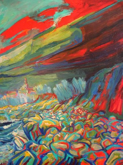 que maravilla!una marejada de color nos va llevando al templo del fondo,que destaca su cupula en un cielo mas y mas tornasolado.Un homenaje a la magia del color.Bellisimo