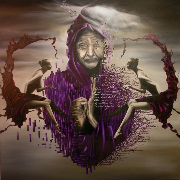 Loquisima, muy surrealista, Daliliana, las formas se extraen del fondo, se acercan al espectador existiendo una suerte de simetria que equilibra el diseno y solo esta interrumpido por la posicion de las manos, luego la luz increccendo desde el plano superior que pasa a formar parte de la figura principal el personaje de la obra, aquel que dice las sabias palabras