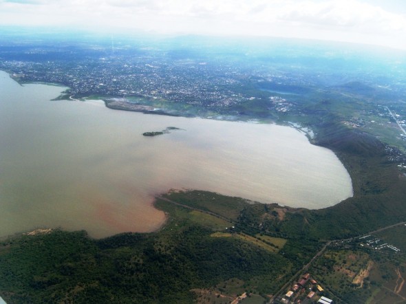 Vista aérea del Lago de Managua, se aprecia parcialmente la ciudad con su verde caracteristico al ser observado desde arriba.