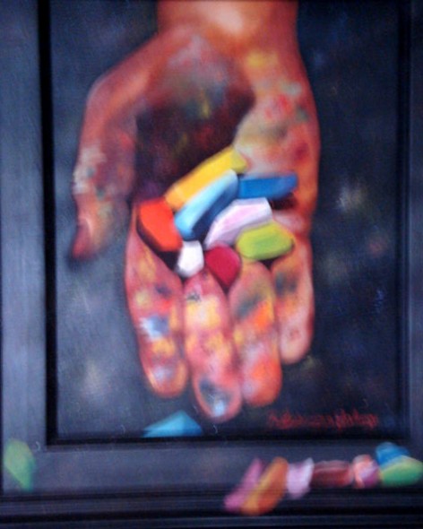 A imagem remete ao artista plástico que tudo dá: o amor à arte, o material de pintura, os pincéis e, o mais importante: a mão. Os pedaços de lápis pastel caem sobre a tela e sobre a moldura.