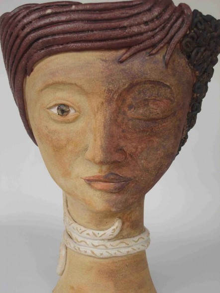 Copa torneada sobre la que se reproduce el rostro de una mujer, mitad latina, mitad africana, símbolo del encuentro y del reconocimiento de la mujer con/en otras mujeres y de la celebración por el camino ya recorrido y por los pasos que se siguen dando