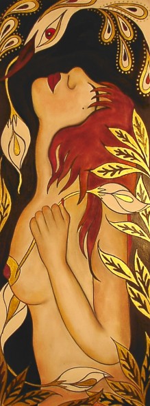 Hola Alexy: Una obra muy sugerente por su estética y composición. Al principio me ha recordado a Klimt, pero mirándola mejor veo que no, tiene una belleza de cartel de los 50. Me gusta. Un saludo