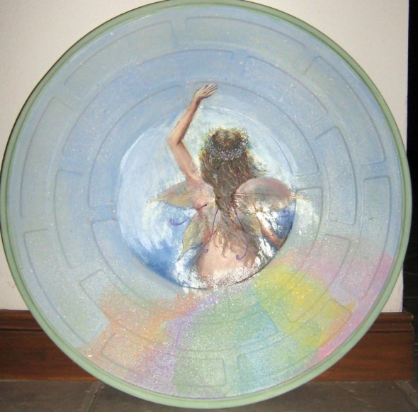 las alas del hada del portal realizadas con hojas esqueletizadas, se aprontan a volar por el jardin