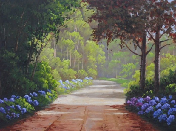 Tu galeria tiene obras muy hermosas y no sabia cual elegir pero escogi esta porque me gusta este camino lleno de flores que trasmite una tranquilidad inmensa, buenos los efectos de luz y sombras de los arboles y la profundidad del paisaje.