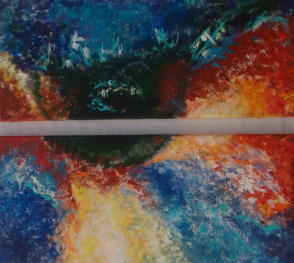COMO rOMPIENDO EL UMBRAL DE LA VIDA,en una linea que se pierde en el infinito, una gama de colores bien definidos y logrados, propios de una maestria ejecutada como tu solo lo sabes hacer.INICIO una lluvia de colores entre lo oscuro, y la luz dan un contraste casi tridimensional, y se siente tu sentimiento espiritual. FELICITACIONES viviana