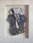 Cerámica Rakú en mosaico de 4 piezas montada sobre tela con un doblez y enmarcada en caja veneciana.