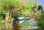 El agua al pie del rancho, rio desbordado por la creciente. Un hombre sentado en la escalera del ranchito.